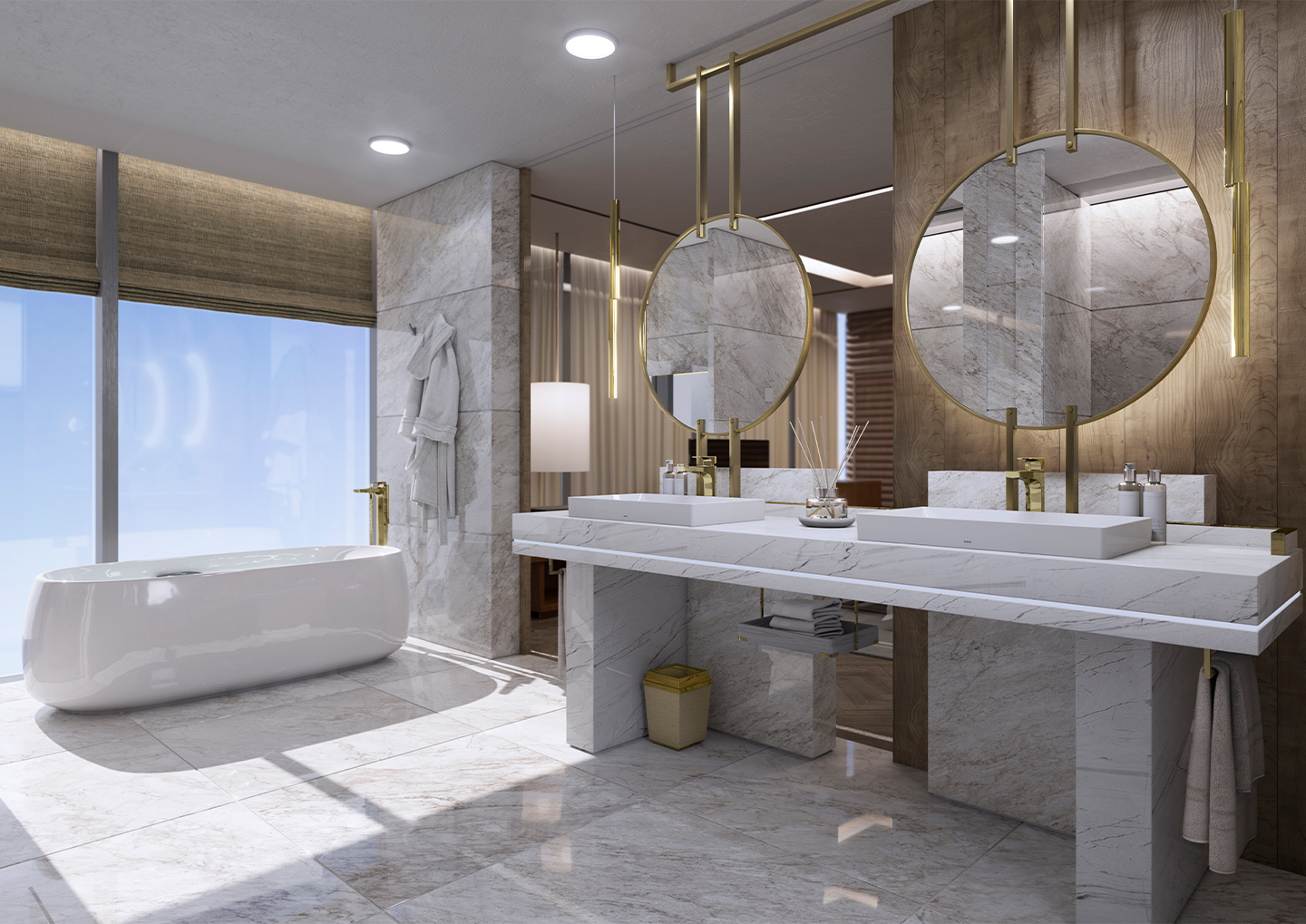 酒店客房也使用了相同的设计并采用非接触式感应水嘴。