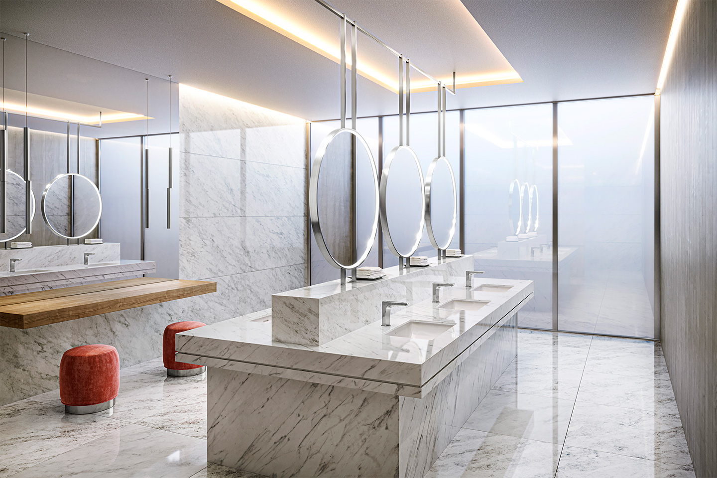 吊灯与天花板上悬挂的超大圆形镜子相呼应,水嘴则采用经典的V形设计,明亮的多面体反射营造出丰富的视觉效果。