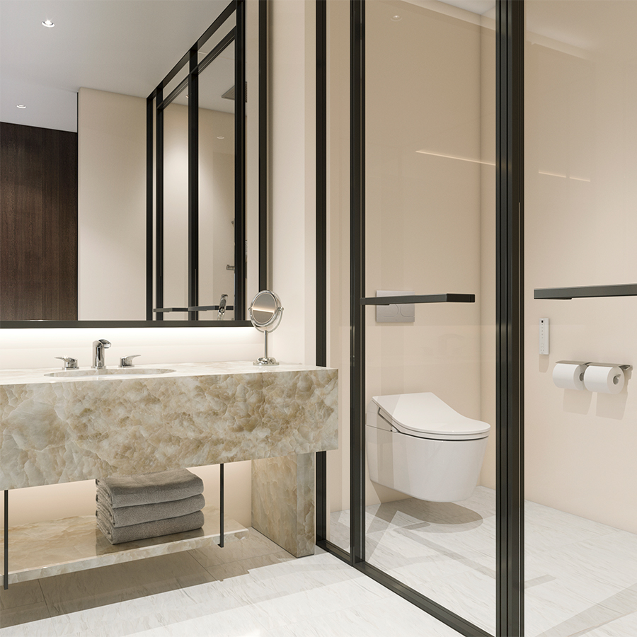 黑色镶边玻璃隔断和米色大理石梳妆台增强了酒店卫浴空间的优雅感,它们无缝连接,让你在套房的任何地方都能欣赏风景。
