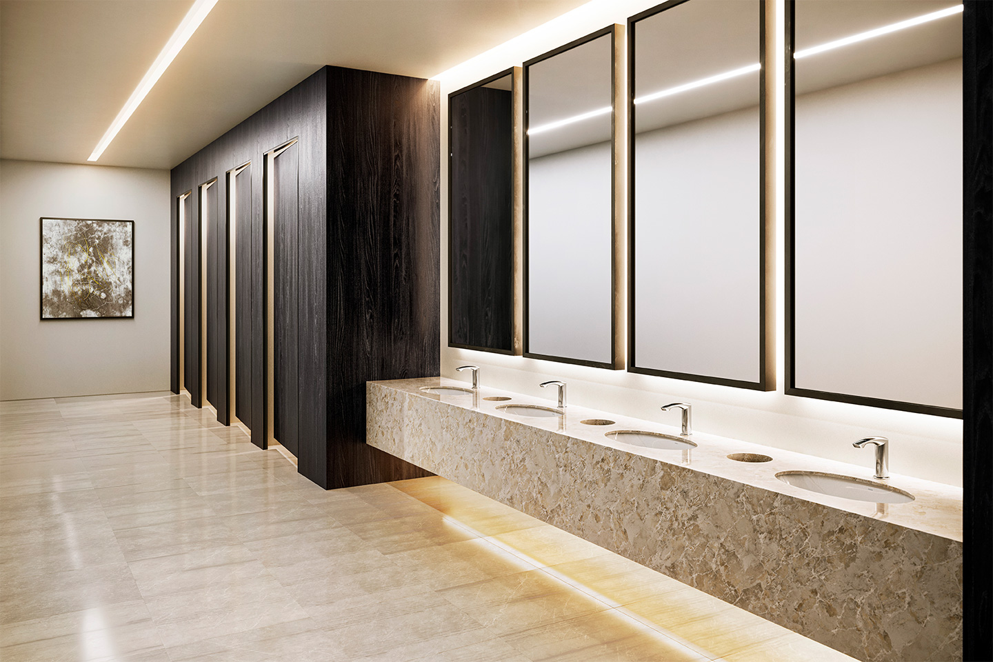 酒店的公共卫生间也使用了相同的设计并采用非接触式感应水嘴。