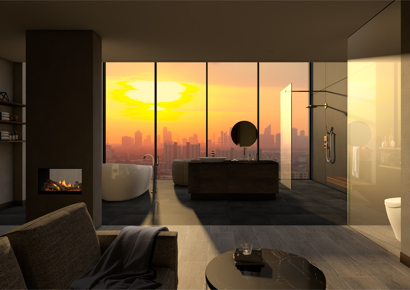 穿过客厅,眼前出现的是大面积的落地窗和设置于窗边的卫浴空间,让人感觉飘然如临云端。