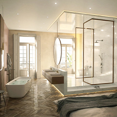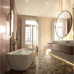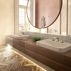 超大的圆形照明镜子和洗面器,水嘴表面采用了抛光式镀金表面,这些都增添了卫浴空间的奢华感并展现出传统之美。