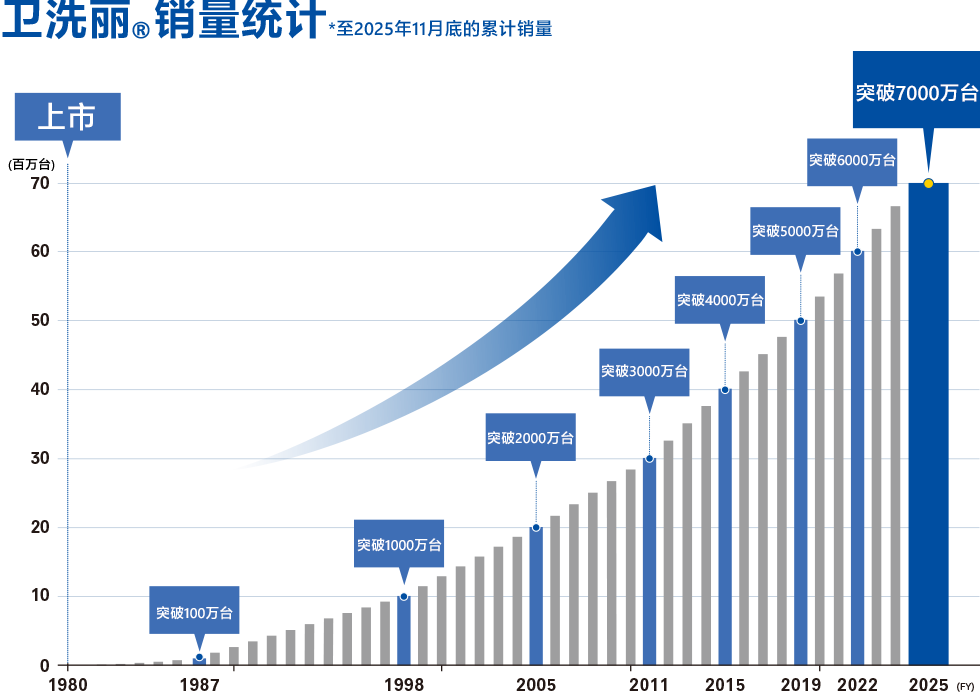 最终达成7,000万台卫洗丽销售成就。在不断地更新迭代中,TOTO将水洗文化传播至全球。